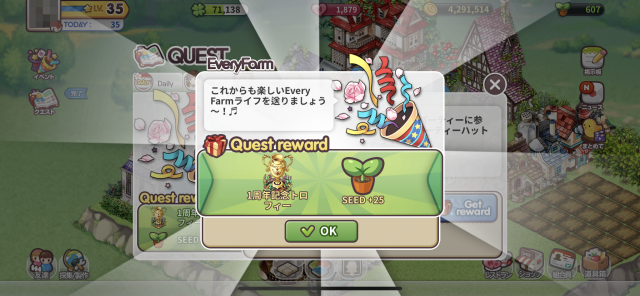 報酬はXP、ハート、SEED、制作アイテムや工場と多彩です。