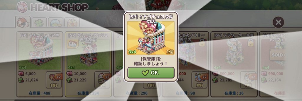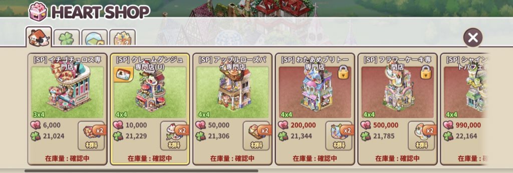 と思われるかと思いますが、いちおう私少しだけですが買えましたので(ちなみに6000円ほど課金して10万H用意しました。構造物も買ったので予算的にチュロスとクレームダンジュ1つずつが精一杯。後述しますがアップルローズパイまでは買いたかったし全部2つずつはほしかった)、