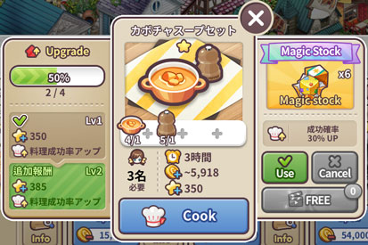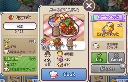 左側のUpgrade欄には、何回成功するとその料理のレベルが上がるかと、現在の成功回数が表示されています。