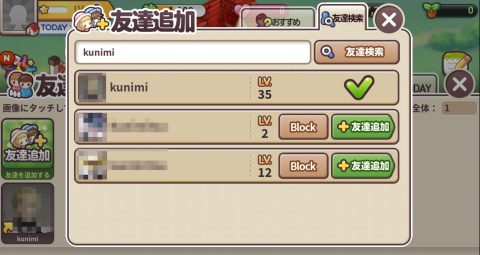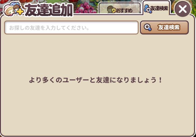 また、すでに知り合いがプレイしていて、その人のお庭に行きたい場合は「友達検索」のタブで友達の名前を入力します。