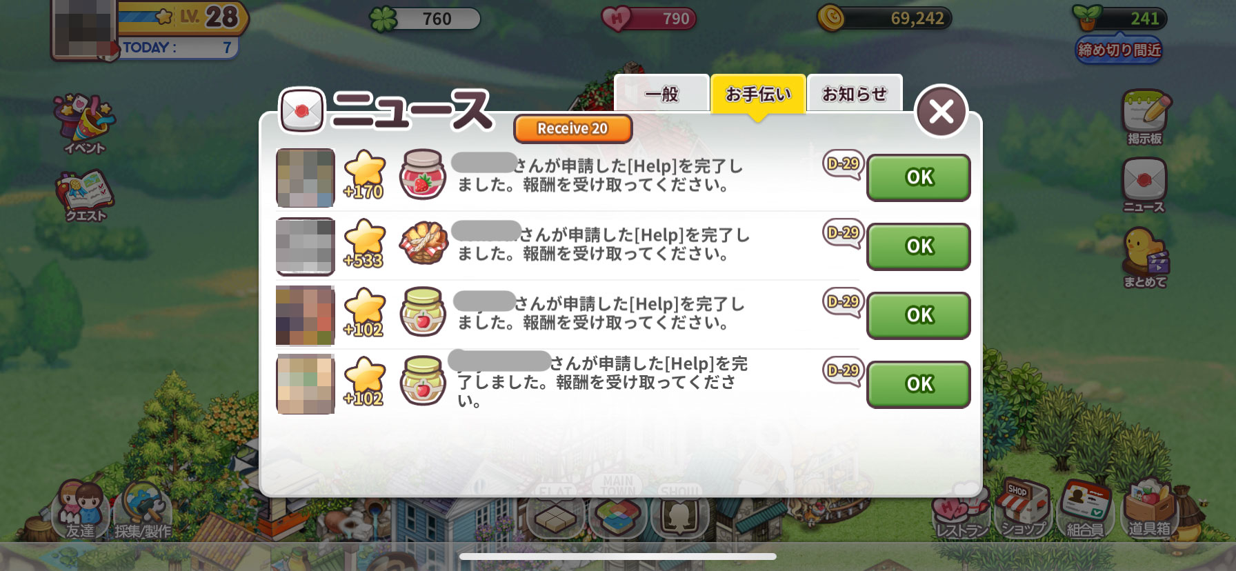 お手伝いが成功すれば、その生産品を作ったと同じXPが入りますし、その生産品がもらえます。